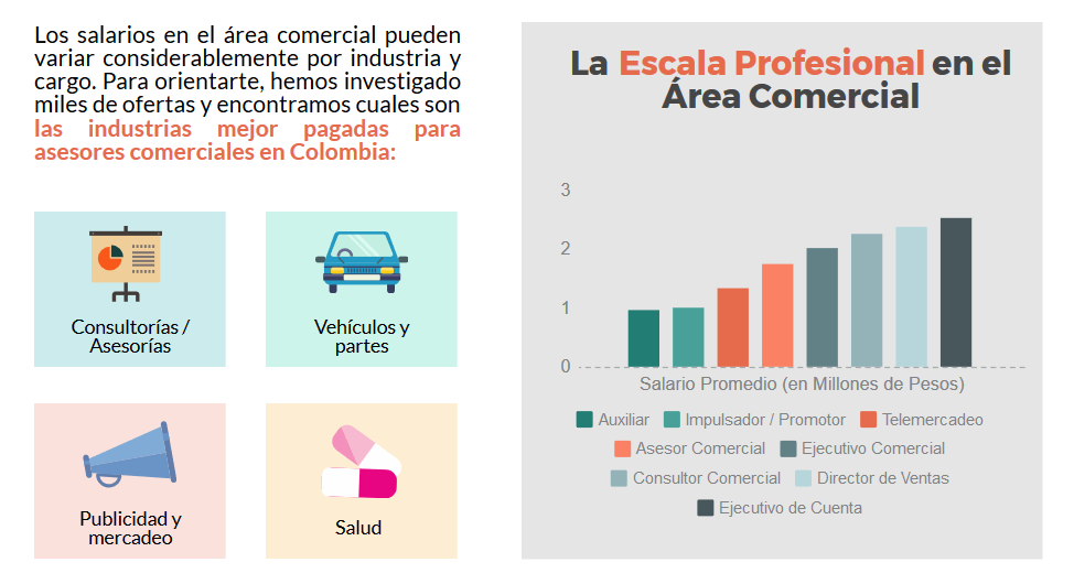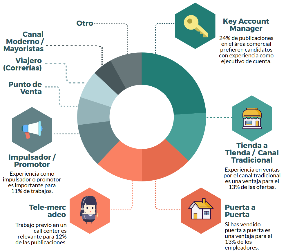 En el área comercial según lo indicó Rivera, las industrias que más están buscando activamente perfiles en sectores de salud, financiero, asegurador y consultorías o asesorías, en ese mismo orden. Por otra parte, los cargos que más están buscando son de ejecutivo de cuenta y de vendedor puerta a puerta.