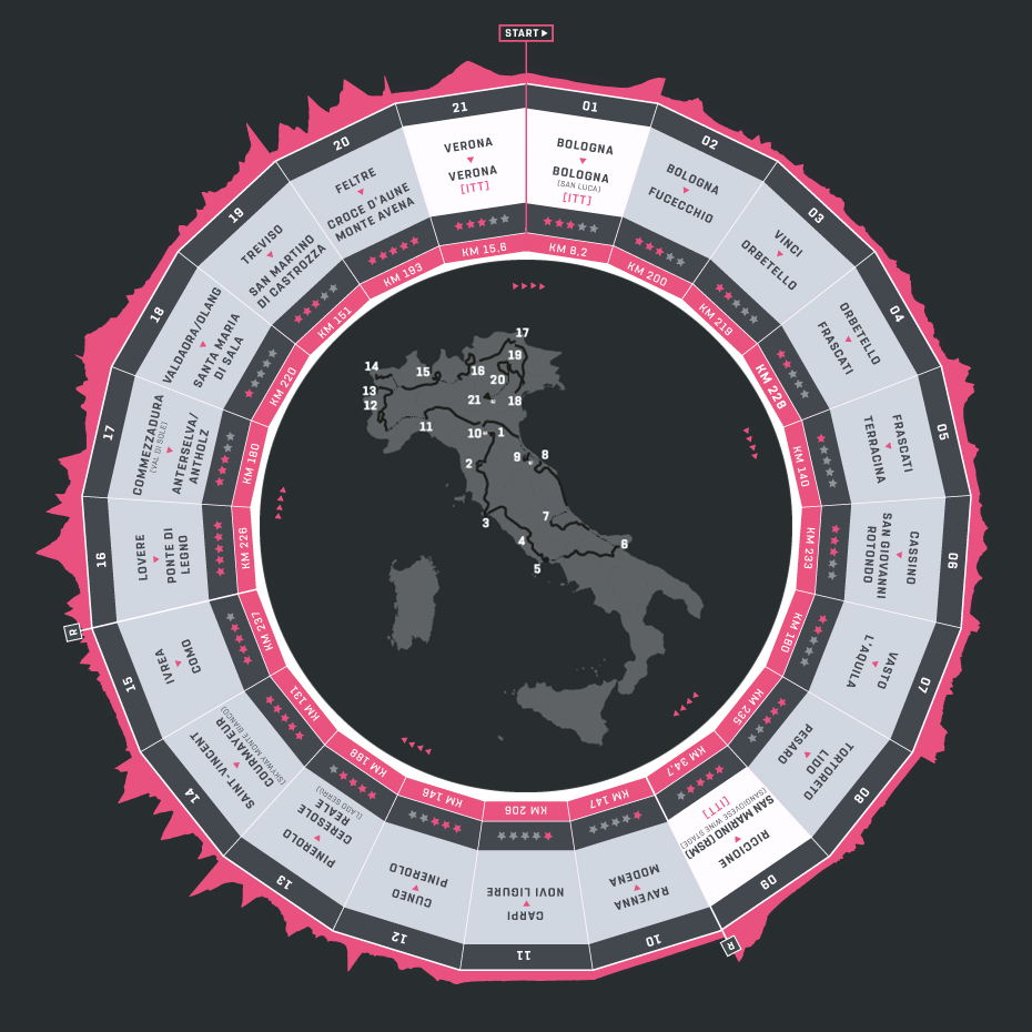 Las veintiuna etapas del Giro de Italia 2019.
