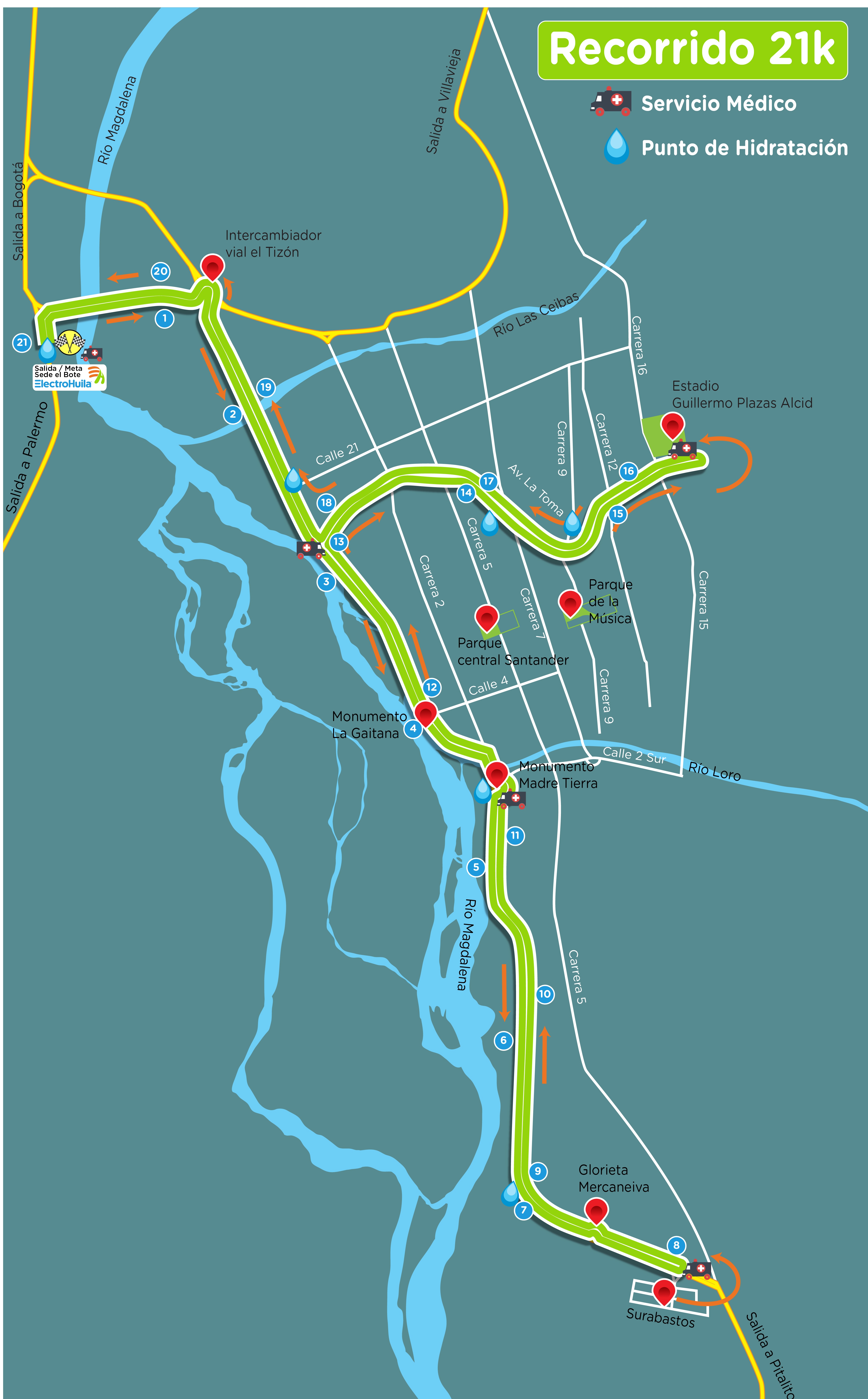 Además de ser un evento deportivo la media maratón rinde un homenaje a la ciudad de Neiva por su cumpleaños y el río Magadalena, hasta hoy se realizarán las inscripciones y los kit deberán ser reclamados un día antes de la competencia, los tres recorridos tendrán el mismo punto de partida, se pasará por lugares como el Puente Santander, la Avenida Circunvalar, Monumento Madre Tierra, Avenida Inés García de Durán, Avenida La Toma, entre otros sitios emblemáticos de la ciudad.