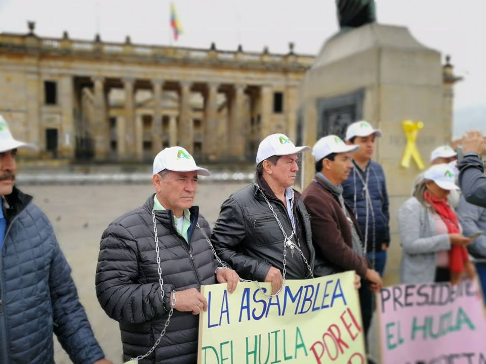 Ante la grave crisis que enfrenta el Huila en materia vial y a raíz de la emergencia que se mantiene en el sector de Pericongo, los 12 diputados del departamento, debieron desplazarse a Bogotá, donde se encadenaron en la Plaza de Bolívar, como forma de protesta para exigirle al Gobierno cumplimiento con la región.