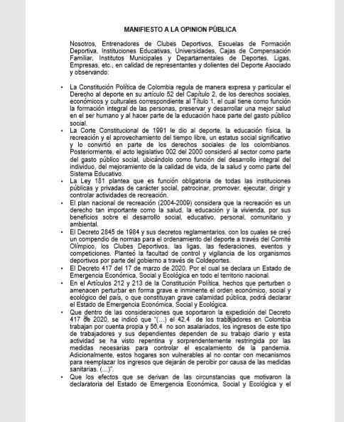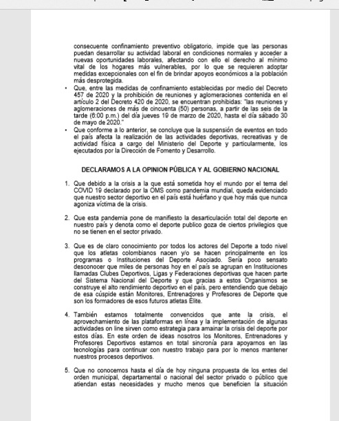 En los puntos desarrollados se enuncia que el sector deportivo quedó huérfano, que la pandemia pone de manifiesto la desarticulación total del deporte en nuestro país y denota como el deporte público goza de ciertos privilegios que no se tienen en el sector privado. Reconocen también la oportunidad para utilizar plataformas online para sus procesos, pero que se desconoce una propuesta local, departamental o nacional del sector público o privado para los protagonistas del deporte asociado.