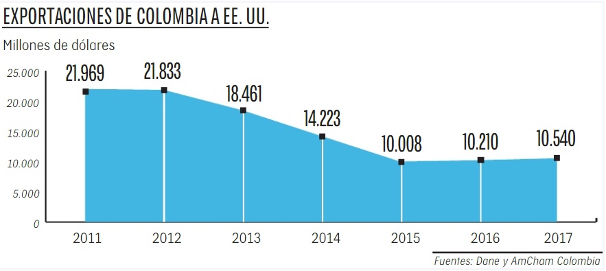 Lo cierto es que las cifras de la evolución de las exportaciones de Colombia a los Estados Unidos indican un decrecimiento en los últimos 6 años. Según el Dane, en el 2012 se vendían $21.800 millones y el año pasado sumaron US$10.000 millones.
