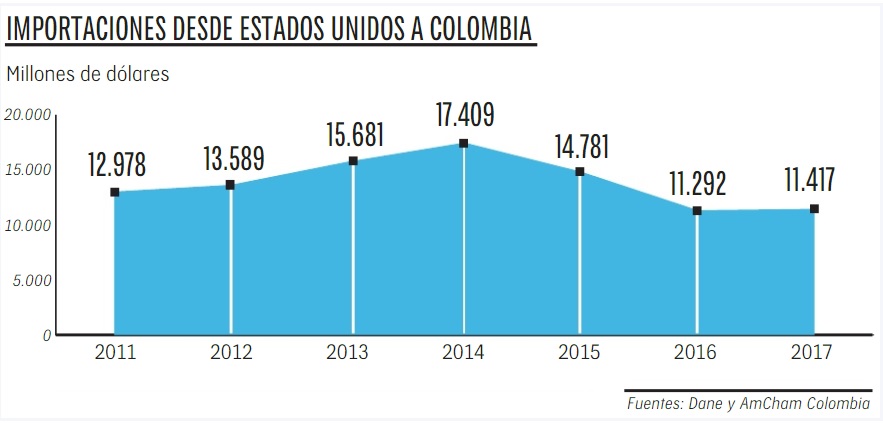 En 2017, las importaciones desde Estados Unidos fueron US$12.014,5 millones, un 1,1% más que 2016 cuando ascendieron a US$11.887,9 millones.