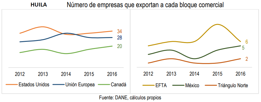 De acuerdo al ‘Informe de Coyuntura Económica 2017’ elaborado por la Cámara de Comercio de Neiva, “se concluye una marcada preocupación sobre la estructura de las exportaciones del departamento, que dependen mayoritariamente de bienes primarios o commodities sin valor agregado, a excepción del Filete de Tilapia en el que se da un proceso de transformación”.