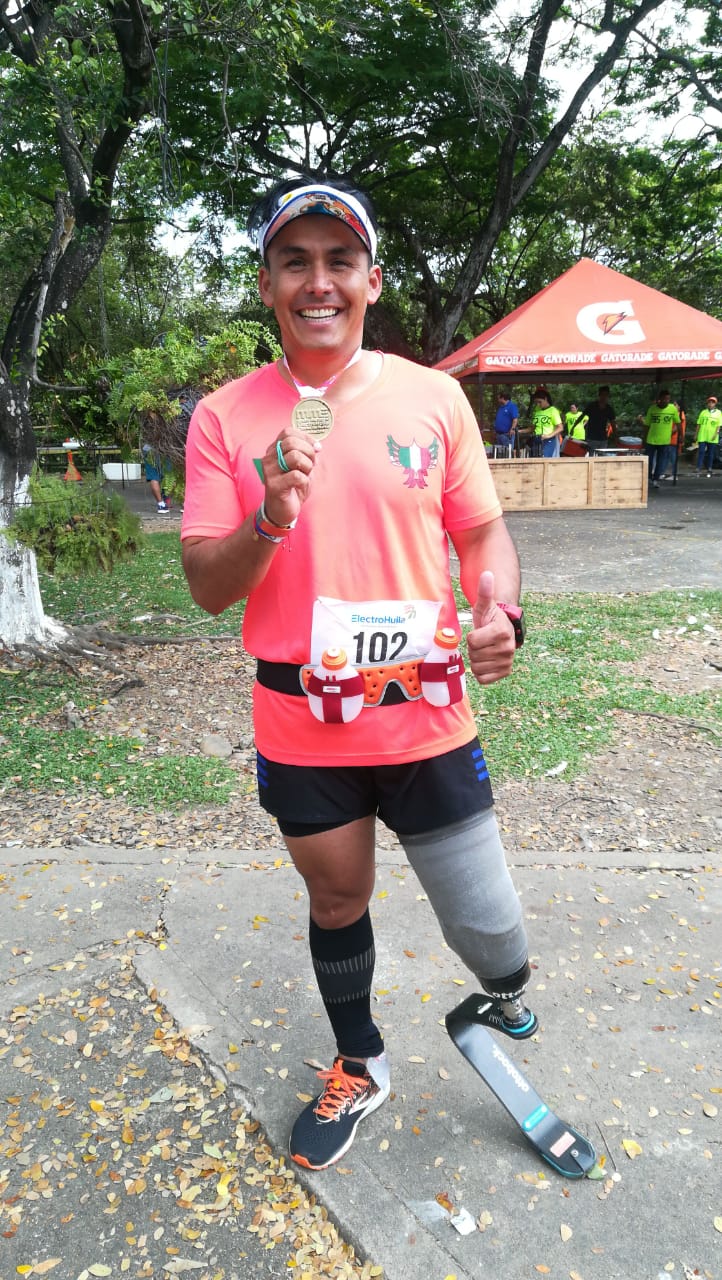 En el año 2008 perdió su pierna como resultado de una mina anti personal, “en el 2009 empecé a correr de forma recreativa con mi prótesis de caminar y eso terminaba muerto de la columna y otras cosas, pero cada vez que había una carrera con el dolor en el alma seguía corriendo, hasta que hace tres años una empresa de prótesis alemana me dio la oportunidad de correr profesional y me donó el gancho y ya llevo varias maratones en mi vida y ahora me preparo para estar en la Media Maratón de Bogotá”.