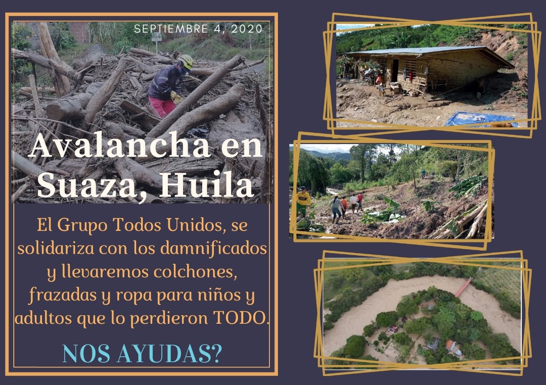 Luego de que más de 60 familias resultaran damnificadas por los estragos de la naturaleza del pasado jueves, un grupo de amigos ha decidido empezar una recolecta de elementos para poder llevarlos este sábado hasta el municipio. Cualquier persona interesada en ayudar se puede comunicar al 3115368331 con Adriana Cuenca quien es la persona encargada de recolectar estos elementos y de llevarlos a Suaza.