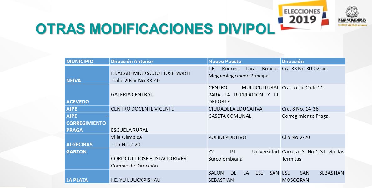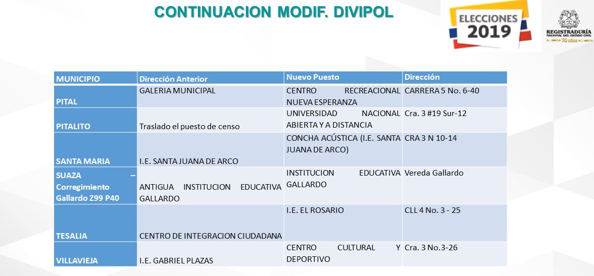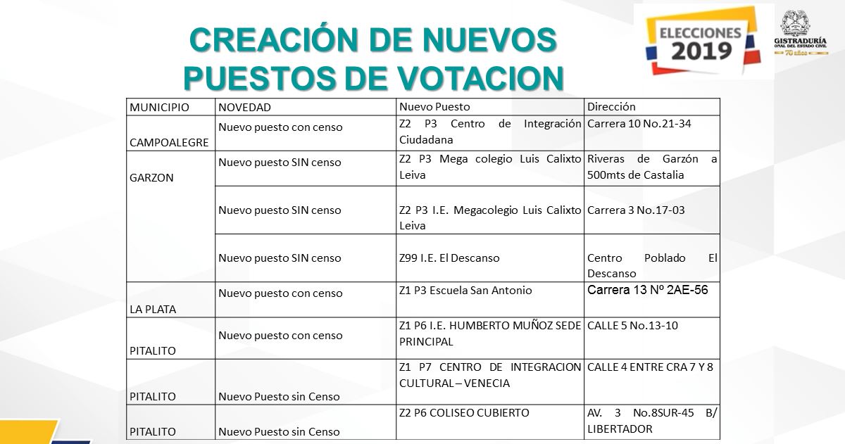 De acuerdo con el registrador delegado, Humberto Carrillo Torres, para las elecciones de este 2019 habrá nuevos puestos y cambios en otros sitios de votación en el Huila.