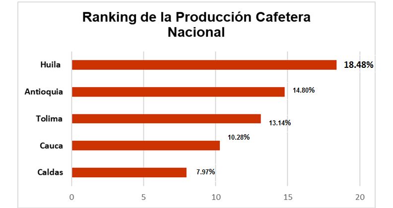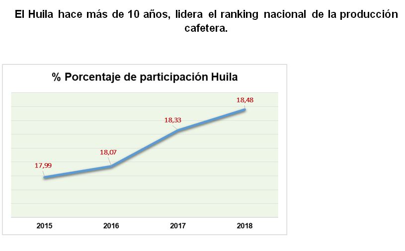 Según el informe dado por la Gerencia Técnica en el pasado Congreso Cafetero, en el último año cafetero, comprendido entre octubre de 2017 y septiembre de 2018, el Huila tomó más ventaja con respecto a los demás departamentos productores, con una participación del 18.48%.
