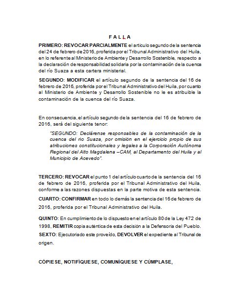 Además, indica que «la CAM y el municipio de Acevedo, con el obligado acompañamiento del Departamento, deben acometer de manera inmediata las medidas técnicamente exigibles, jurídicas y presupuestalmente viables, a fin de atender y mitigar impactos generados por el vertimiento de la aguas residuales y sin tratamiento a la cuenca del Río Suaza en las inspecciones y dar solución paulatina pero irrevocable».