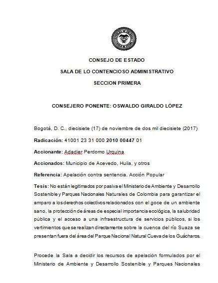A raíz de una Acción Popular interpuesta en agosto del año 2010 por Adadier Perdomo Urquína, contra el municipio de Acevedo, el Gobierno Seccional, la Corporación Autónoma del Alto Mágdalena – CAM, el Ministerio del Medio Ambiente y la Dirección Nacional de Parques Naturales, tras el avanzado abandono institucional en el que se encuentra el parque Los Guácharos, el pasado 9 de febrero el Alto Tribunal ordenó, entre otras acciones, instalar plantas de tratamientos de aguas residuales en la Inspección San Marcos, San Adolfo y Acevedo, en pro de la recuperación y conservación de la cuenca del río Suaza.