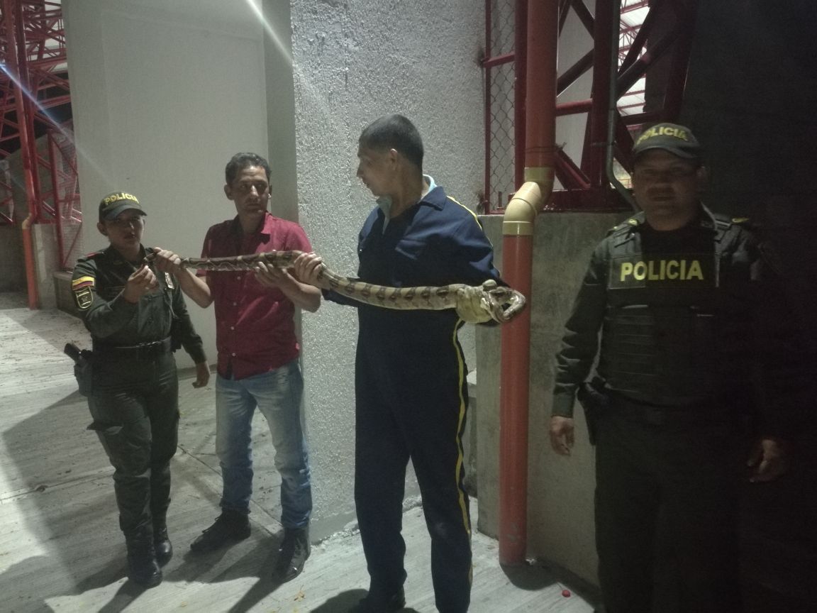 El rescate fue efectuado en el mega colegio ubicado en el municipio. La culebra se encontraba en lo alto de la estructura de la institución. Los uniformados treparon hasta llegar a donde estaba localizada la serpiente, asimismo la metieron en un saco para bajarla de este sitio.