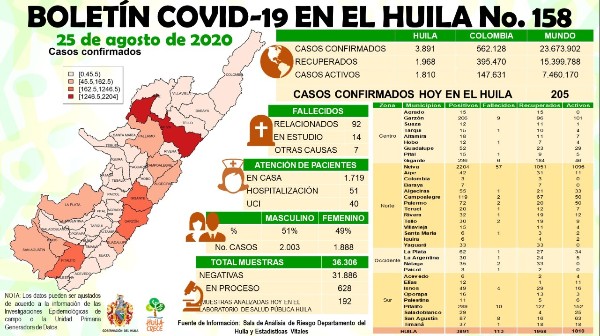 La Secretaria de Salud Departamental confirmó 205 casos nuevos de Covid19 en el Huila. A nivel nacional fueron 10.432 casos nuevos y 277 fallecidos en Colombia