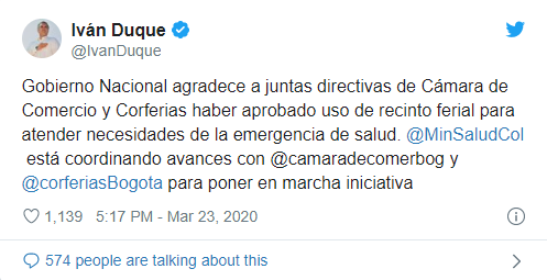 El presidente Iván Duque anunció, a través de su cuenta de Twitter, que fue aprobado el uso de Corferias "para atender las necesidades de la emergencia de salud" en el país provocada por el covid-19, el cual ya registra 277 casos en todo el territorio nacional.