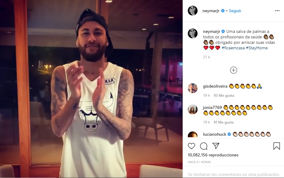 Futbolistas como el brasileño Neymar en sus redes sociales aplauden la labor incansable que hacen los profesionales de la salud, Neymar con este mensaje y un video en el que aplaude sin parar homejaó su labor titánica, “Uma salva de palmas a todos os profissionais da saúde, obrigado por arriscar suas vidas, #ficaemcasa #StayHome” en español expresa: “Un aplauso para todos los profesionales de la salud, gracias por arriesgar sus vidas #QuedateEnCasa #QuedarseEnCasa”.