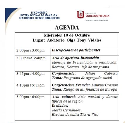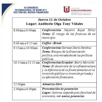 Según Carlos Salamanca, director de Cesposur, el centro de investigación y el programa de Administración Financiera de la USCO, realizan el 10, 11 y 12 de octubre la tercera versión del evento que en esta oportunidad tendrá un enfoque más internacional que se enriquece con la presencia de expertos que provienen de países con experiencias recientes en situaciones económicas que merecen ser compartidas en detalle, como lo son Argentina, Ecuador y Francia.