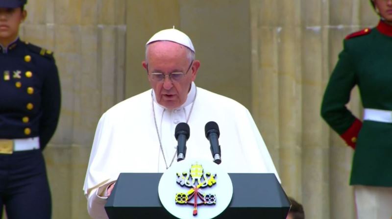 “Queremos dar, con su aliento, el primer paso. Queremos reconciliarnos. Queremos reconocernos en las diferencias y aceptar al otro, no como una carga, sino como un don, un don de vida. Bienvenido a Colombia, Su Santidad”, le manifestó Santos tras recibirlo con honores, a cargo del Batallón Guardia Presidencial, en la Casa de Nariño.