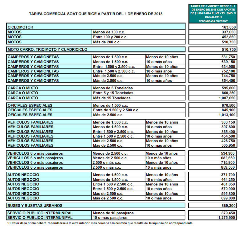 Así quedaron las tarifas del SOAT para 2018