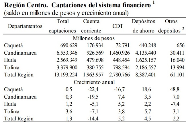 A escala territorial, Cundinamarca concentró el 49,7% de los depósitos o captaciones; le sigue: Tolima, Huila y Caquetá al participar con 25,6%, 19,5% y 5,2% de los recursos, respectivamente. Dentro de las ciudades capitales de departamento que conforman la regional, sobresale: Ibagué al corresponderle el 18,5% de las captaciones y obtener una variación anual de 6,8%.