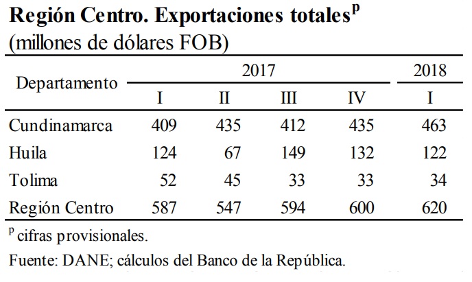 Las cifras de las exportaciones de la zona Centro de Colombia para el primer trimestre de 2018 señalaron un avance del 5,7% respecto a igual lapso del año precedente, alcanzó una facturación de 620 millones de dólares; comportamiento impulsado por las transacciones de productos no tradicionales y en especial de los despachados desde el departamento de Cundinamarca.