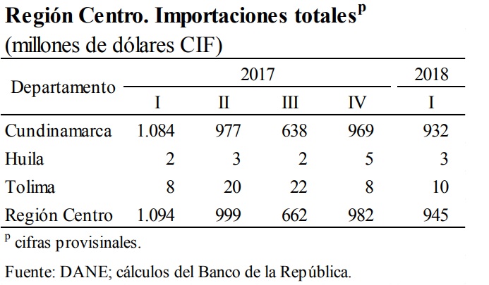 En cuanto a las compras del exterior, en el primer trimestre de 2018, las importaciones de la región Centro se redujeron 13,6% frente a las de igual periodo del año anterior, comportamiento influenciado en gran parte por la caída significativa en la adquisición de mercancías de consumo duradero y en menor proporción, de combustibles y lubricantes, así como de materias primas con destino a la agricultura y la industria; conducta asociada en parte a la debilidad de la demanda interna.