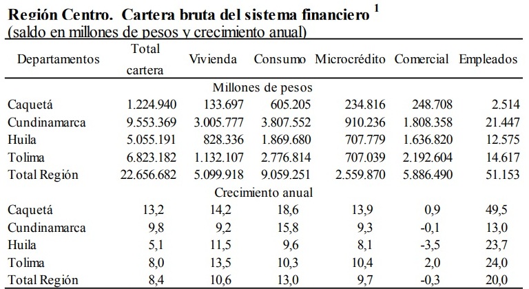 Entre tanto, el crédito a microempresarios se mantuvo en terreno positivo (incremento de 9,7%) mientras la cartera comercial se redujo 0,3% con énfasis en Huila. En términos absolutos los departamentos con el mejor desempeño son Cundinamarca y Tolima. El agregado de las ciudades capitales (Ibagué, Neiva y Florencia) les correspondió el 41,2% de la cartera bruta regional y creció un 6,0%; destacándose consumo y vivienda.