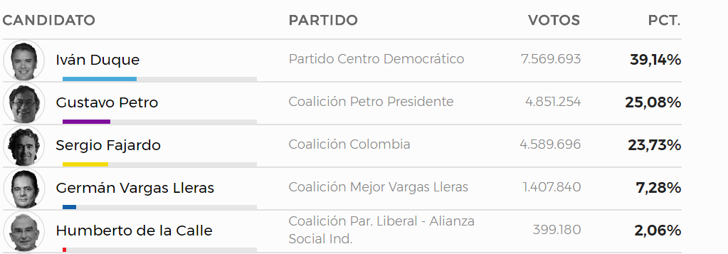 La Registraduría Nacional del Estado Civil dio a conocer los resultados de la primera vuelta de las elecciones presidenciales, las cuales se llevaron a cabo en todo el territorio colombiano. La jornada contó con 36’219.940 de colombianos habilitados para participar en los comicios.