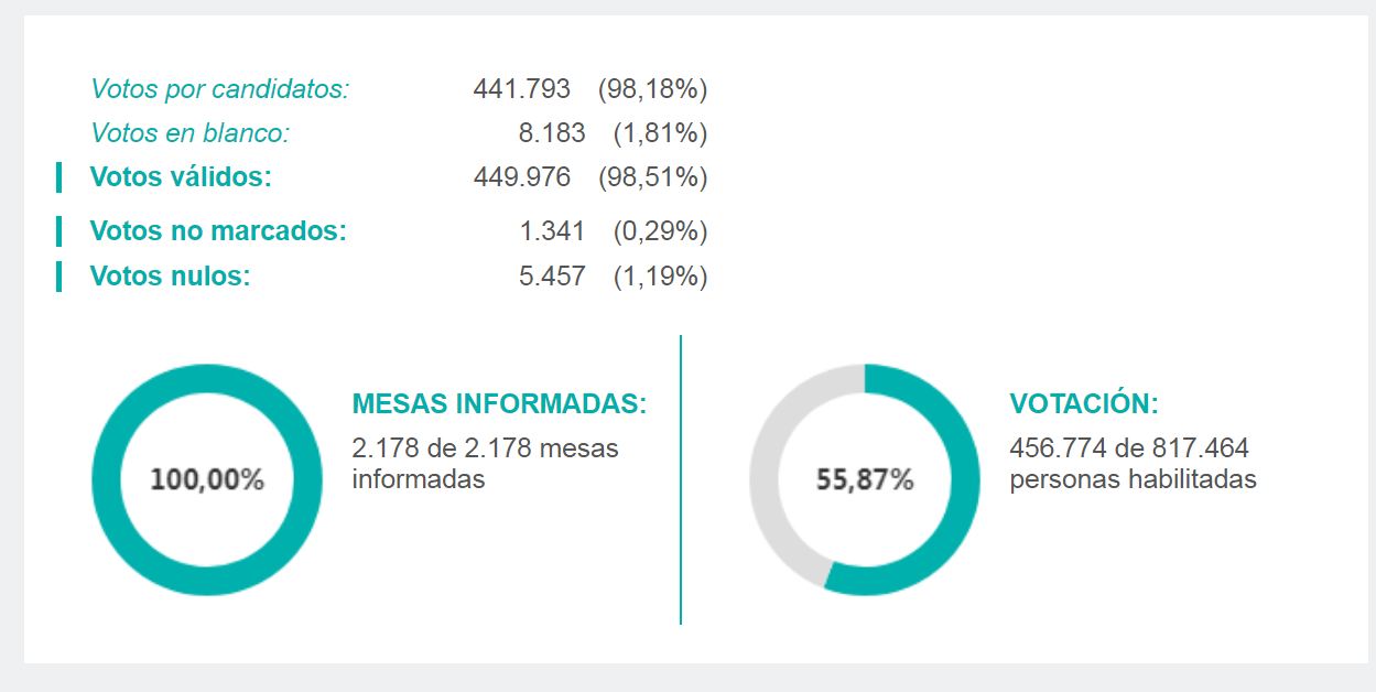 Finalmente, hay que resaltar que de las 817.464 personas habilitadas, 456.774 es decir el 55,87% de la población, ejerció su derecho al sufragio, lo cual representa una disminución en el abstencionismo frente al año 2014 (primera vuelta) cuyo porcentaje fue del 41,54%.