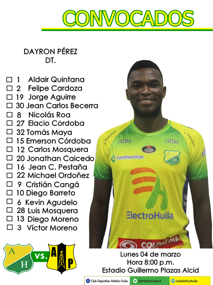 Con seis puntos en la tabla de posiciones al igual que su rival Alianza Petrolera, el Atlético Huila recibirá hoy al conjunto ‘petrolero’ en el estadio Plazas Alcid desde las 8:00 p.m juego válido por la fecha ocho de la liga colombiana de fútbol.