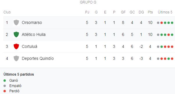 De esta manera los dos equipos llegan a acumular 10 puntos, pero la diferencia de goles (8 del Orsomarso contra 4 del Atlético Huila) le da el primer lugar del grupo al equipo que milita en Primera B, proveniente de Palmira, Valle del Cauca.