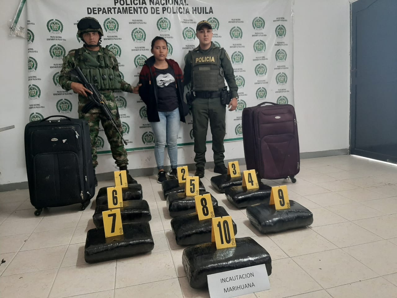 El primer caso presentado en la vía Garzón - LaPlata - Guadualejo, sobre el kilómetro 74 sector conocido como Valencia, unidades de la seccional de transito y trasporte logran la captura de LEIDY JOHANA CIRO LÓPEZ de 20 años de edad, cuando se movilizaba como pasajera desde el departamento del Cauca, hacia el municipio de La Plata, movilizando en dos maletas de equipaje 10 paquetes envueltos en cinta negra, los cuales en su interior contenían marihuana tipo cripy, con un peso de 53 kilos.