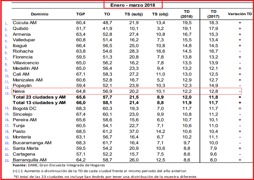 La tasa de desempleo en la capital del Huila disminuyó entre enero y marzo del 2018 y se ubicó 12,2 %, lo que representó una reducción de 0,6% respecto al trimestre del año pasado cuando fue de 12,8%.