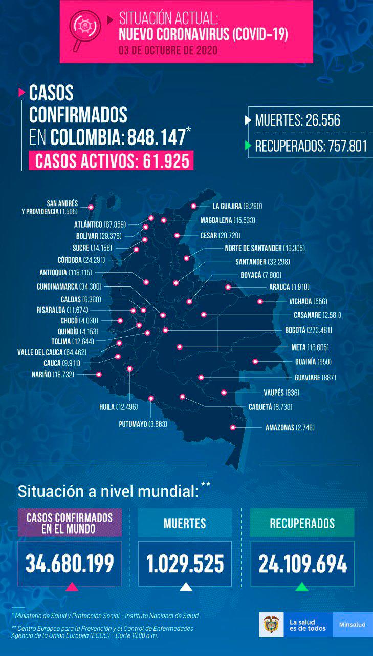 Con esto, Colombia llega a 848.147 casos confirmados y 26.556 fallecidos.