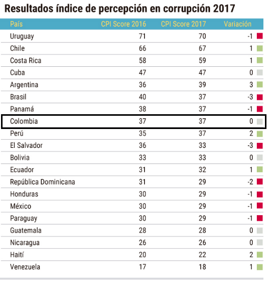 Según el informe Colombia tiene la misma calificación que Brasil, Panamá y Perú. Y se ubica por encima de países como Salvador, Bolivia, Ecuador y México. En Latinoamérica se destacan Uruguay y Chile con 70 y 67 puntos respectivamente, mientras que las peores calificaciones corresponden a Venezuela y Haití con 18 y 22 puntos.