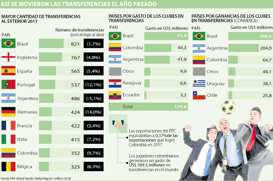 Según el informe anual de la Fifa ‘Global Market Transfer Report 2018’, el país es reseñado como el noveno país del mundo con mayor cantidad de transferencias al exterior con un monto de 352 futbolistas, que representan un crecimiento de 9,7% en comparación con el año 2016, y un recaudo total de US$64,7 millones en exportación de jugadores para 2017. Esta cifra significaría 0,17% de las ventas externas totales en el mismo año.