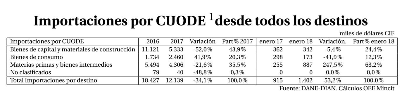 Los principales productos importados desde todos los orígenes en el período enero 2018 son abonos minerales y demás abonos, libros registro, lib y Tractores, cuya participación es 60.8 %.