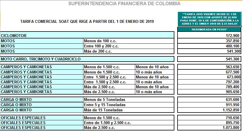 Sin embargo, dado que la prima comercial del SOAT está indexada al Salario Mínimo Mensual Legal Vigente, la SFC publica para conocimiento del público su valor expresado en pesos, incluyendo la contribución del 50% a la ADRES y la Tasa RUNT que es definida por el Ministerio de Transporte.