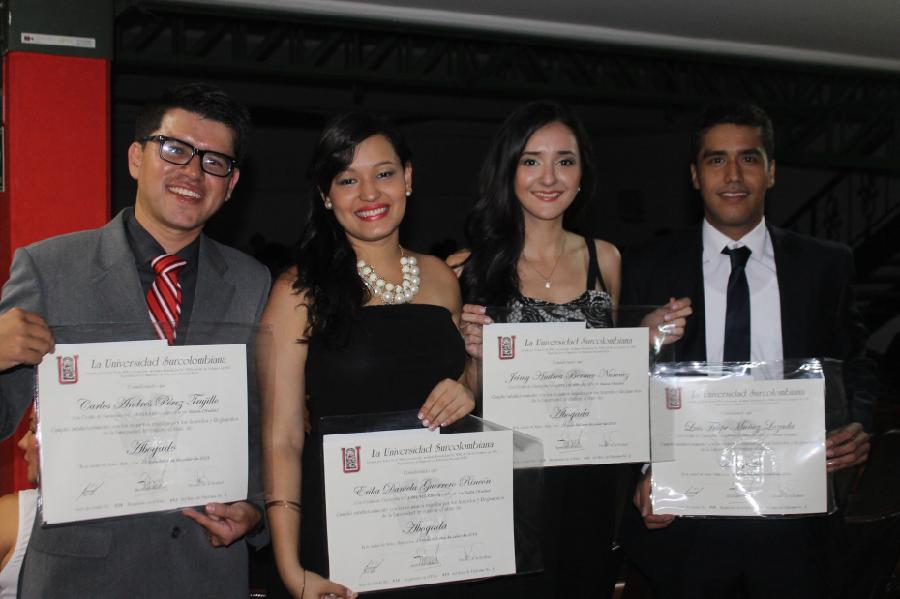 Ayer la Universidad Surcolombiana confirió el título de Abogado a Carlos Andrés Pérez Trujillo, Daniela Guerrero, Jeimy Andrea Bermeo y Felipe Muñoz.