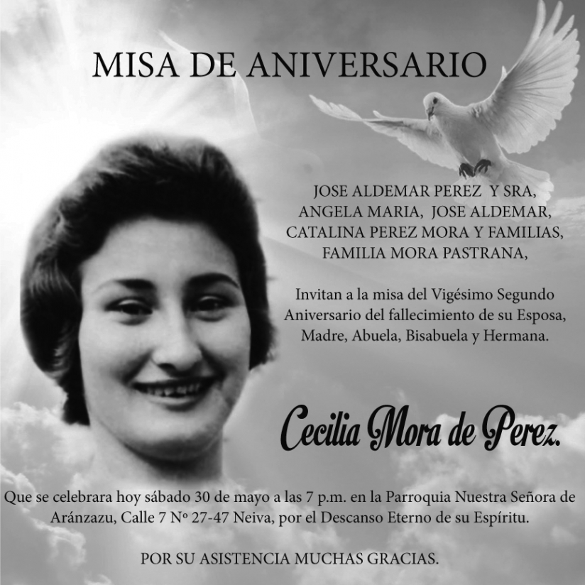 José Aldemar Pérez y sra, Ángela Maria, José Aldemar, Catalina Pérez Mora y familia Mora Pastrana. Invitan a la misa del Vigésimo Segundo Aniversario del fallecimiento de su Esposa, Madre, Abuela, Bisabuela y Hermana Cecilia Mora de PérezQue se celebrara hoy sábado 30 de mayo a las 7 p.m. en la Parroquia Nuestra Señora de Aránzazu, Calle 7 Nº 27-47 Neiva, por el Descanso Eterno de su Espíritu.
