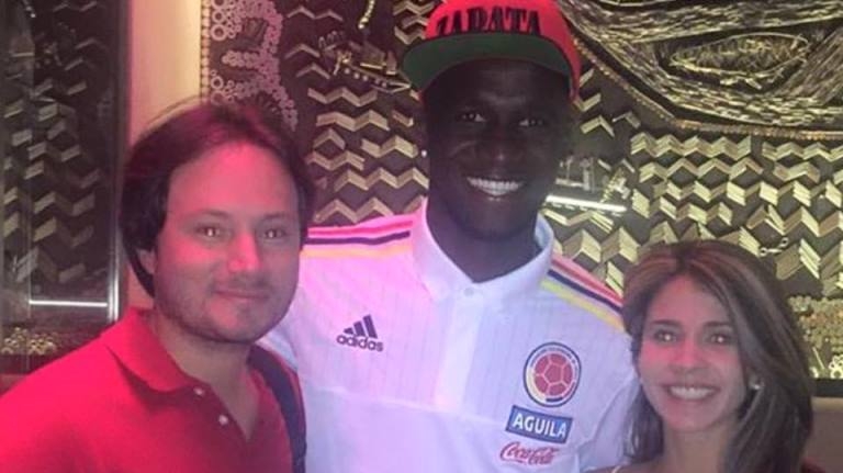 Los esposos huilenses Catalina Camargo de Cabrera y Pipe Cabrera Cabrera compartieron con algunos miembros de la selección Colombia antes del partido contra Perú en el estadio Red Bull Arena, en New Jersey.