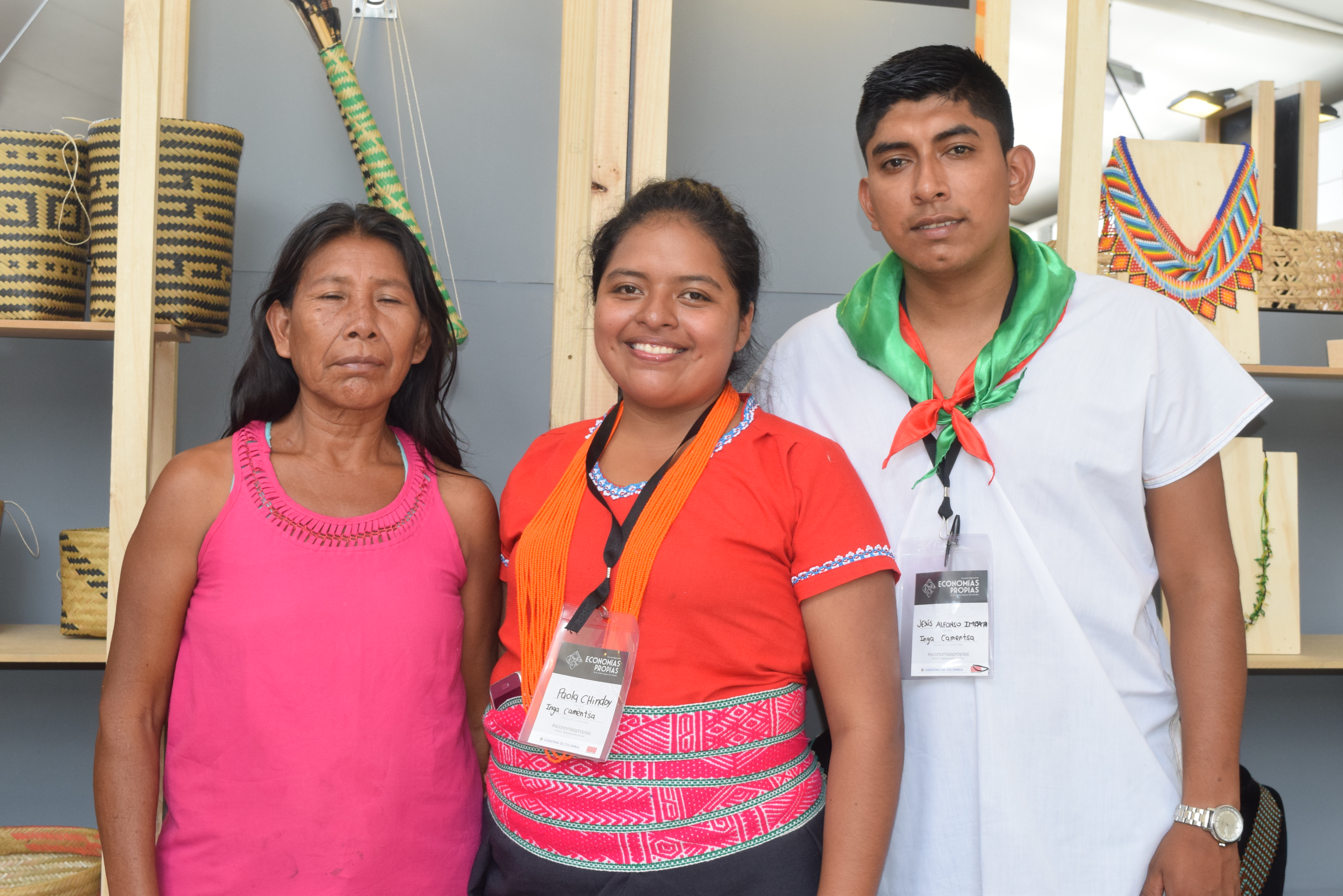 Fanny Chindoy y Marta Liliana Garreta Chindoy de la comunidad indígena Yunguillo junto a Leónidas Gutiérrez Koreguaje de la comunidad Milán.