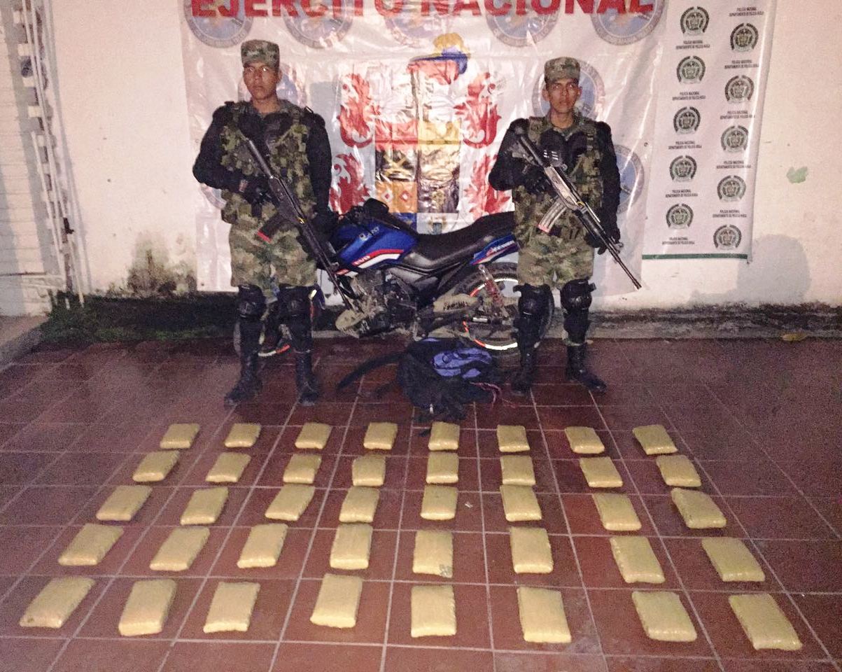 En la primera acción se solicitó detenerse a un hombre que se desplazaba en una motocicleta por el sector de la vereda Casarrocines, jurisdicción del municipio de La Plata. El sujeto hizo caso omiso a la señal de pare y emprendió la huida, tras la persecución, se vio obligado a abandonar la motocicleta en la que transportaba 40 paquetes de marihuana que arrojaron un peso de 20 kilos.