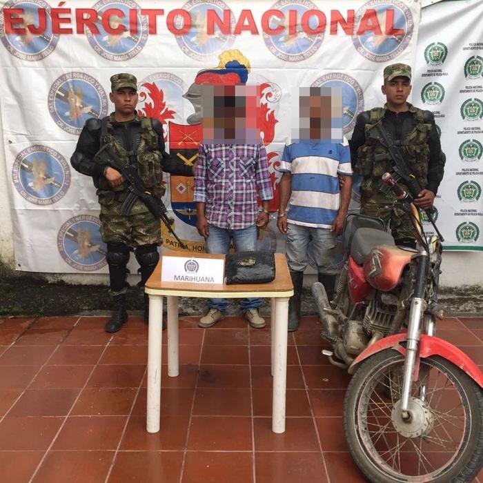 En el mismo sector fueron capturados dos hombres identificados como José Arquímedes Pancho Sanza de 36 años y Jesús Antonio Ángel Alzate de 53 años de edad, quien tras el registro voluntario se les halló una bolsa plástica con 517 gramos de marihuana, siendo puestos a disposición de la autoridad competente.