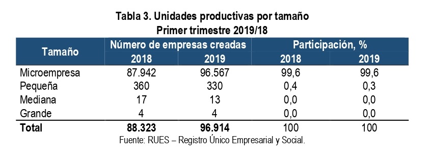 En el orden nacional, Confecámaras expresó que indistinto del sector económico, la mayor concentración por tamaño de empresa se presenta en las microempresas (99,6 %), seguido por las pequeñas empresas (0,3 %).