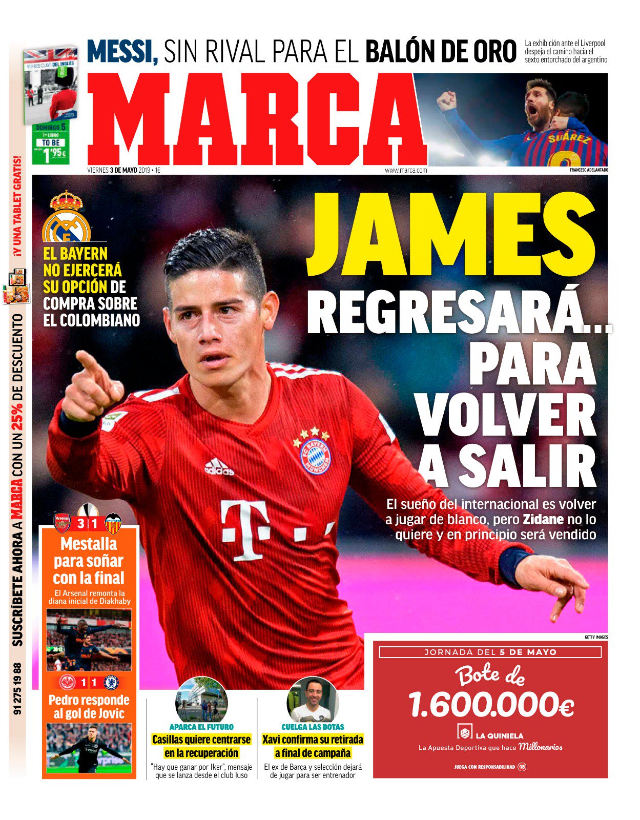 La portada de mañana 3 de mayo del diario deportivo Marca es sobre la actualidad deportiva del jugador colombiano James Rodríguez.