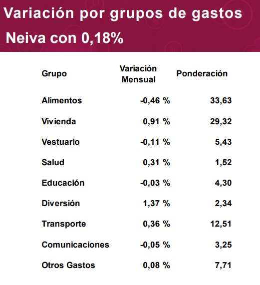 De acuerdo con el último informe del Índice de Precios al Consumidor (IPC) del Departamento Nacional de Estadísticas (DANE), en mayo la inflación de Neiva se situó en 0,18%, lo que representó un aumento de 0,25 puntos porcentuales respecto al mismo mes de 2017 cuando se ubicó en -0,07%.
