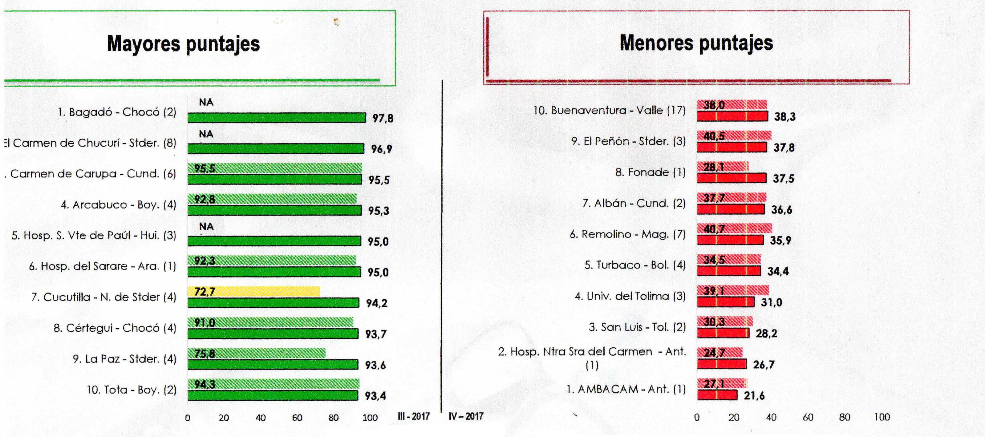 En el mismo reporte aparecen en el quinto lugar con 77.2, rango medio el hospital Hernando Moncaleano de Neiva, en el sexto lugar con 76.8 rango medio la Ese Miguel Barreto López de Tello y en el puesto 14 el hospital Nuestra Señora de Fátima de Suaza, con un puntaje de 64.5, rango bajo.