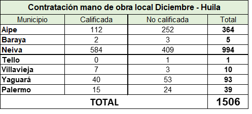 Así mismo, en la Regional Sur, integrada por los departamentos de Huila, Tolima, Caquetá, Putumayo, Antioquia, Caldas, Risaralda, y Valle se contrataron en el mes de diciembre 2.403 trabajadores, de los cuales el 93,4% correspondió a mano de obra local.