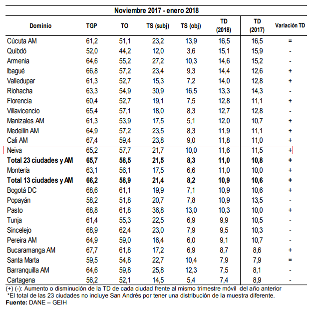 En el caso de Neiva, el desempleo registró un leve aumento de 0,1 puntos porcentuales, al pasar de una tasa de 11,5%, durante el trimestre móvil noviembre de 2016 a enero de 2017 a 11,6% en el mismo periodo de 2018. Mientras que la tasa de ocupación fue 57,7%, de acuerdo con el informe del DANE.