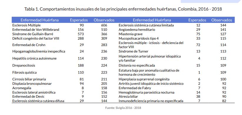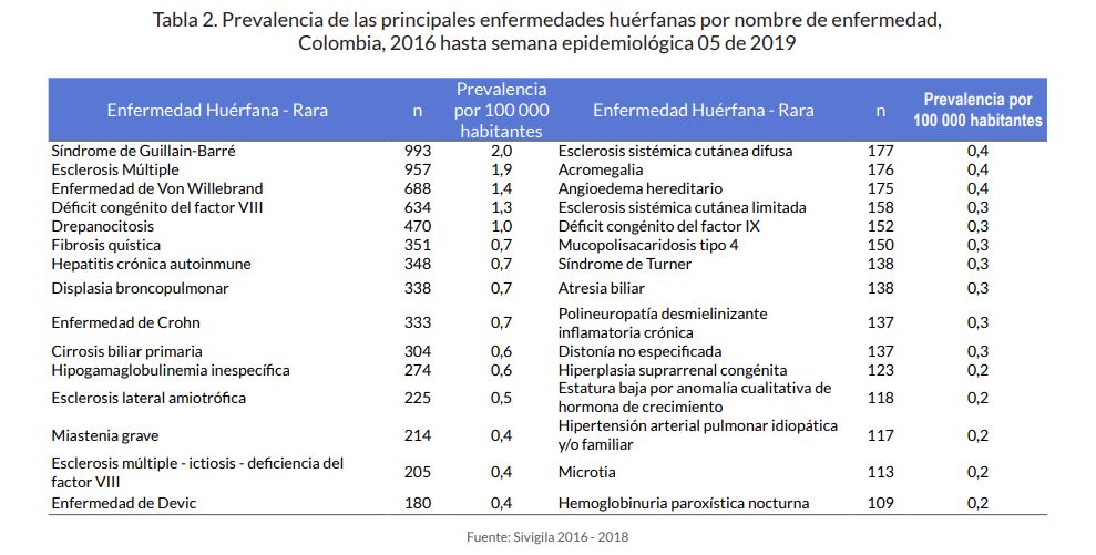 Las enfermedades huérfanas (EH) se caracterizan por ser crónicamente debilitantes, graves, amenazan la vida y acorde con la Ley 1438 de 2011, la prevalencia es menor a 1 por cada 5 000 personas. En Colombia actualmente están listadas 2 198 EH (Resolución 5265 de 2018).