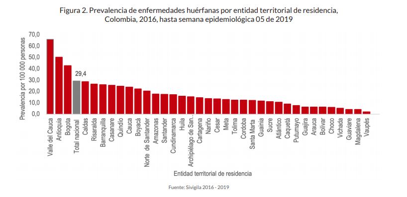 Se notificaron personas con enfermedades huérfanas residentes en todas las entidades territoriales del país; la prevalencia nacional fue de 29,4 por 100 000 habitantes y Valle del Cauca, Antioquia y Bogotá superaron esta prevalencia (figura 2).